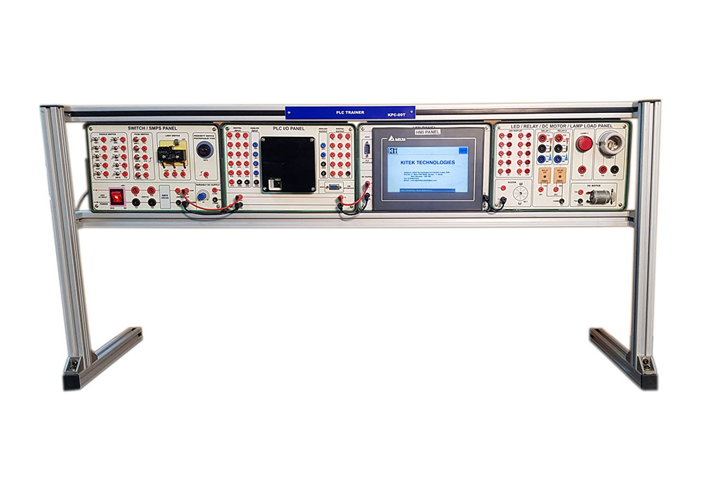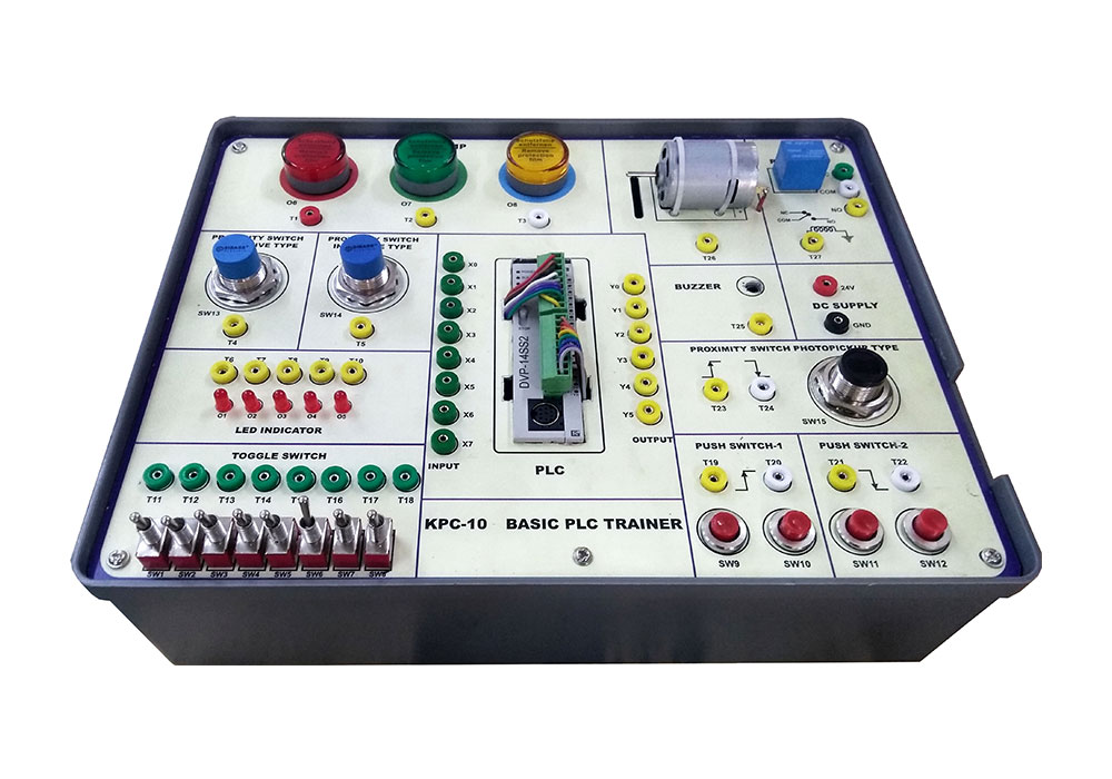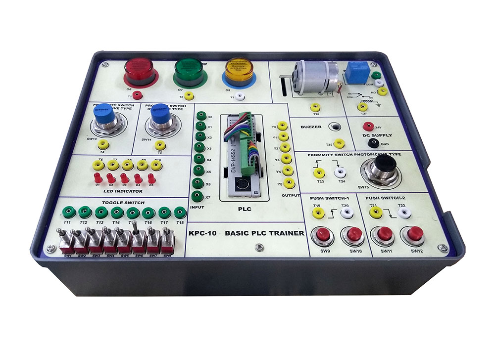 Delta PLC with 8 Digital Input, 6 Digital Output, 8 Toggle Switches, 2 Push Button’s, Proximity Sensors (Inductive, Capacitive, Photo), Pilot Lamps, Relays, DC Motor, Buzzer etc.