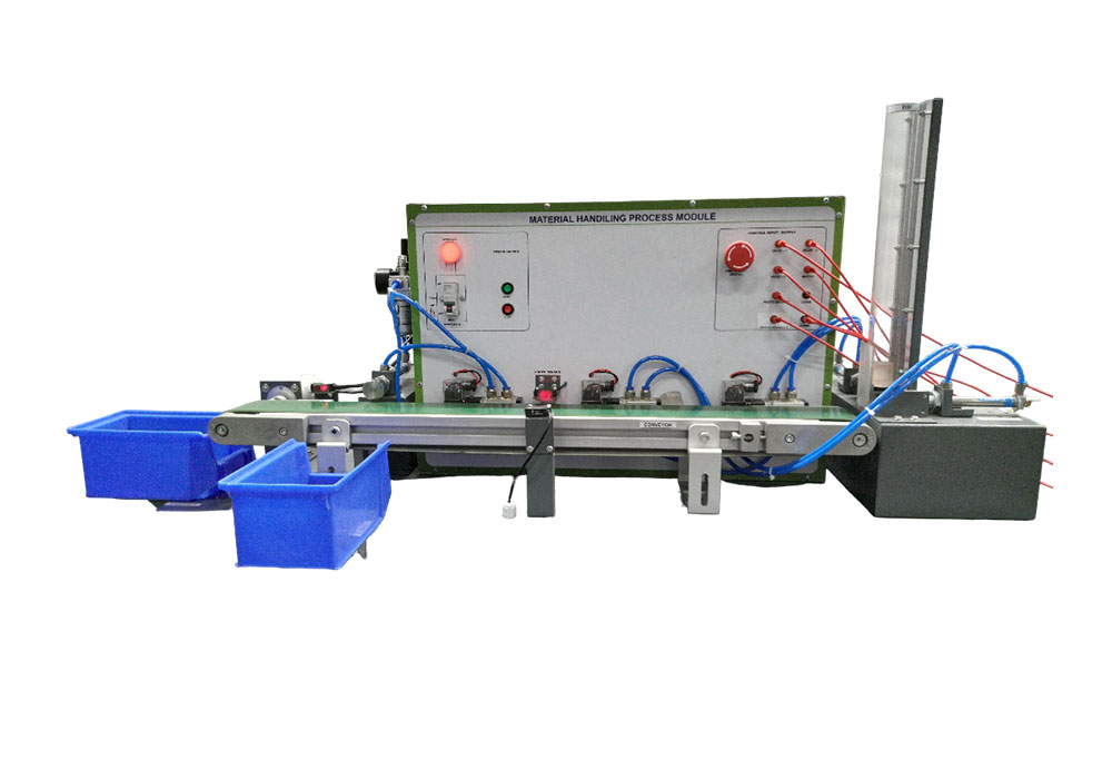 Material Sorting Process Module consist of Solenoid Valve, Motor with Conveyor Belt, Industrial Photo Sensor, Air Compressor, Two Colour Material etc.