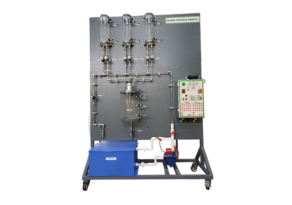Mixing Process Module consist of Liquid Level Sensor (9No’s) & Solenoid Valve (8No’s), 3 No's of Transparent Measuring Tank, 1 No of Transparent Mixing Tank & 1 No of Storage Tank with 0.5Hp Water Pump.