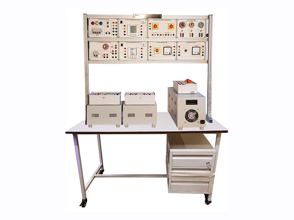 Supplied with but not limited to 3 Phase AC Power Supply, 3 Phase AC Measurement, 1 Phase AC Supply Panel, AC Voltmeter Panel, AC Ammeter Panel, Milliohm (V-I method), Lamp Load, Single Phase Transformer, Three Phase Transformer, AC/DC Resistive Load etc.
