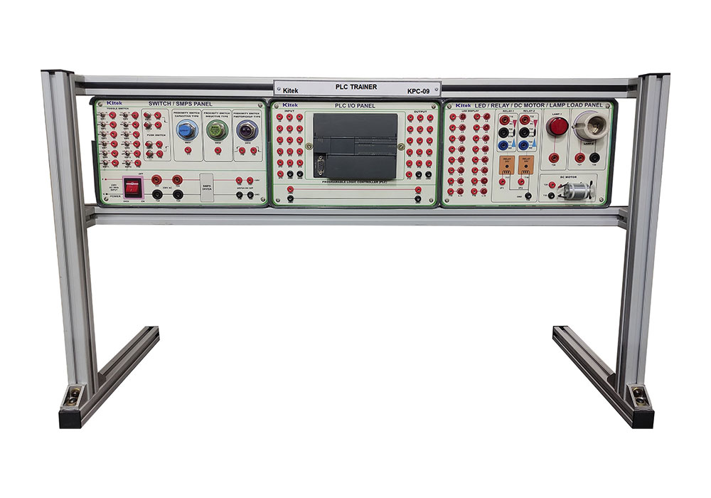 Delta PLC with 8 Digital Input, 6 Digital Output, 8 Toggle Switches, 2 Push Button’s, Proximity Sensors (Inductive, Capacitive, Photo), Pilot Lamps, Relays, DC Motor, Buzzer etc.