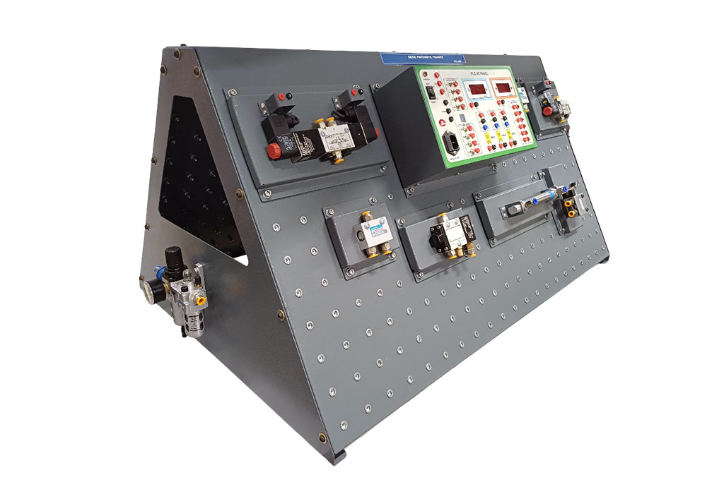 Electro-Pneumatic Trainer consists of flat control panel with general purpose component area provided using 30X30 mm Aluminum profile rack with MS Plate size of 1115 x 940 mm (W x H).